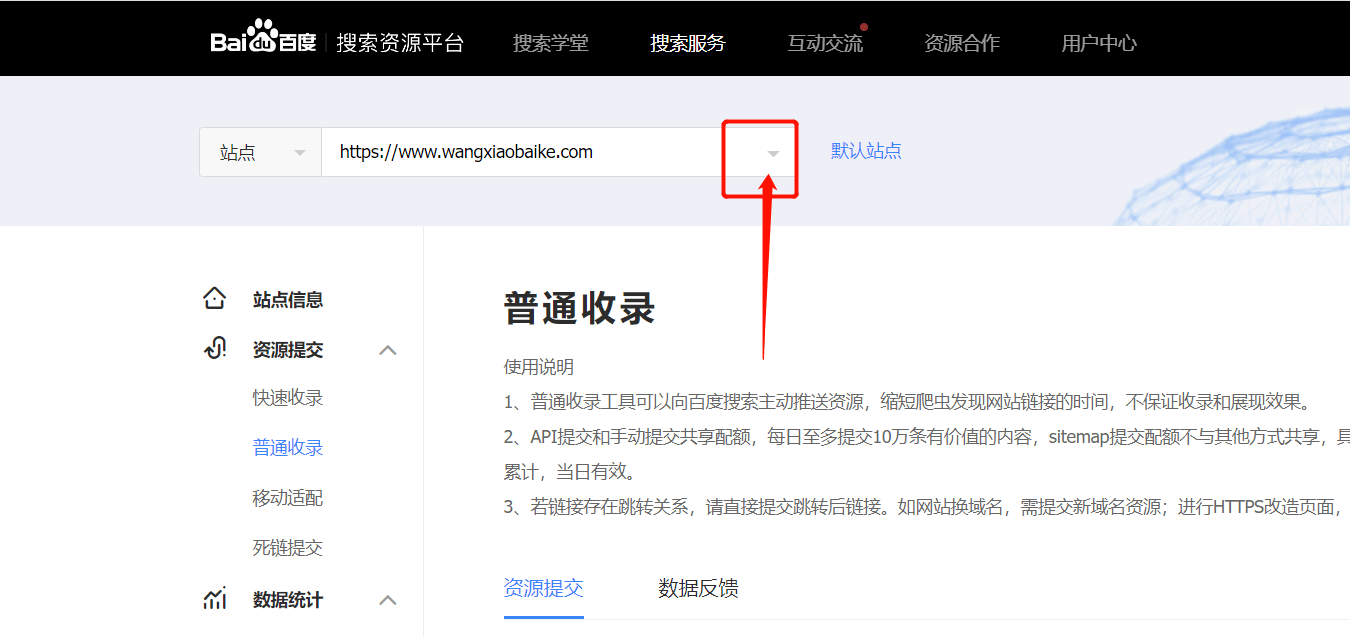 我們點(diǎn)擊頂部的“搜索服務(wù)”,打開下拉菜單,在下接菜單中找到“普通收錄”并點(diǎn)擊它。